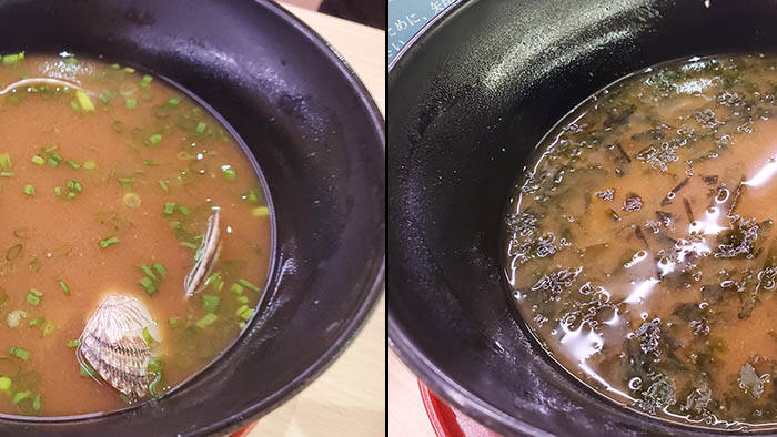 あさりのみそ汁60バーツとあおさ汁60バーツ。あおさ汁にも貝がそこそこ入っています。